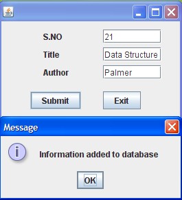String sql=”Insert into library values(‘”+(no)+”‘,'”+(title)+”‘,'”+(auth)+”‘)”;