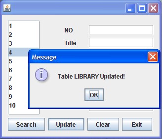 JOptionPane.showMessageDialog(null, “Table LIBRARY Updated!”);